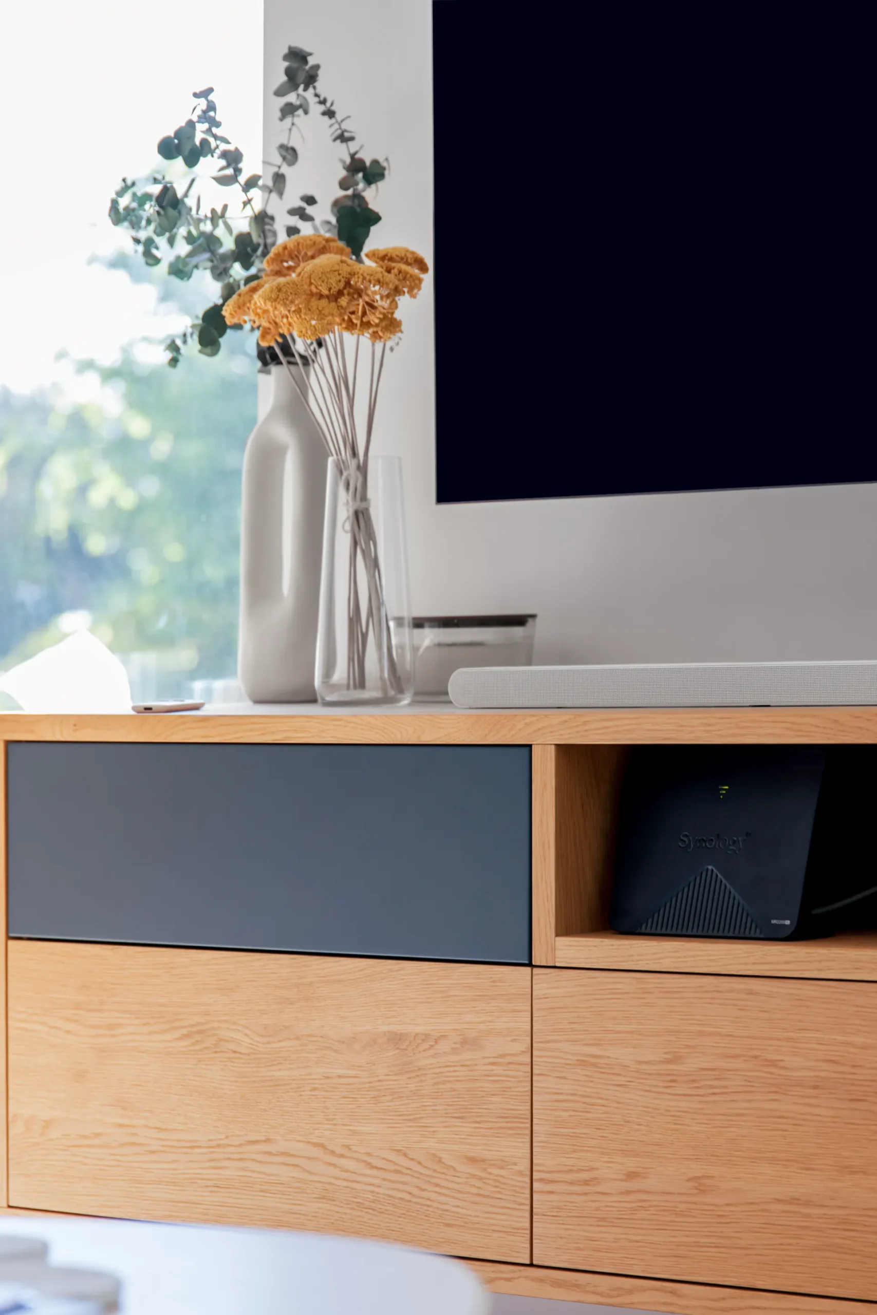 Modern minimalista otthon, ahol a tölgy furnér melegsége és az antracit felületek határozott kontrasztja alkot dinamikus egységet.