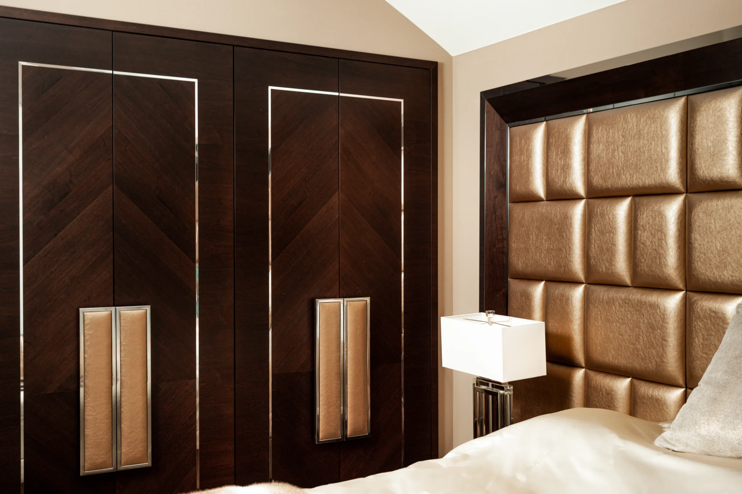 A design központi eleme a geometria és a fény játéka. A hálószobában a sötétszürke gardróbfrontokat függőleges tükörbetétek és hangsúlyos, egyedi króm fogantyúk törik meg, vizuálisan nyújtva a teret. A ferde falsíkok és a háromszög ablak adta építészeti kihívást egy méretpontos, beépített paddal hidaltuk át, amely olvasósarokká szelídíti a holtteret. A közlekedőben a gyémántvágott tükörfal és a nappali texturált betétes bútorai a részletgazdagságot ünneplik.
