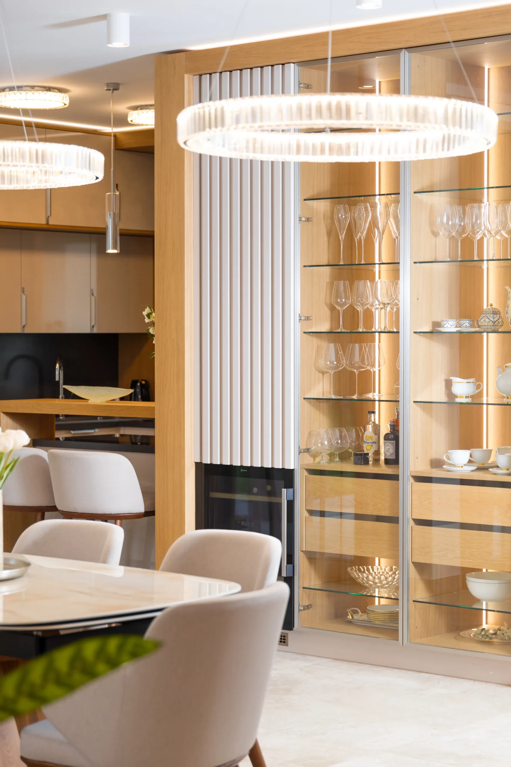 Különleges atmoszférájú otthon, ahol a helyiségek karaktere a funkcióval együtt változik. A konyha lágy kasmír árnyalatait a fürdőszoba nyers kőfelületei és a hálózóna sötét, íves faburkolatai ellenpontozzák, bátor és eklektikus összhangot teremtve.