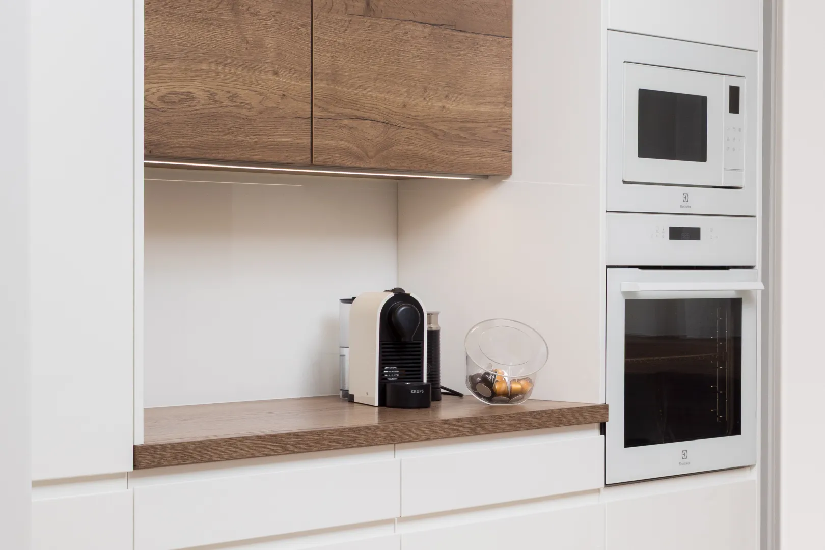 Komplex belsőépítészeti kivitelezés a nappalitól a hálószobáig. A projekt különlegessége a karakteres, repedezett tölgyfa és a steril fehér felületek játéka, rejtett vasalatokkal és egyedi üvegmegoldásokkal fűszerezve.